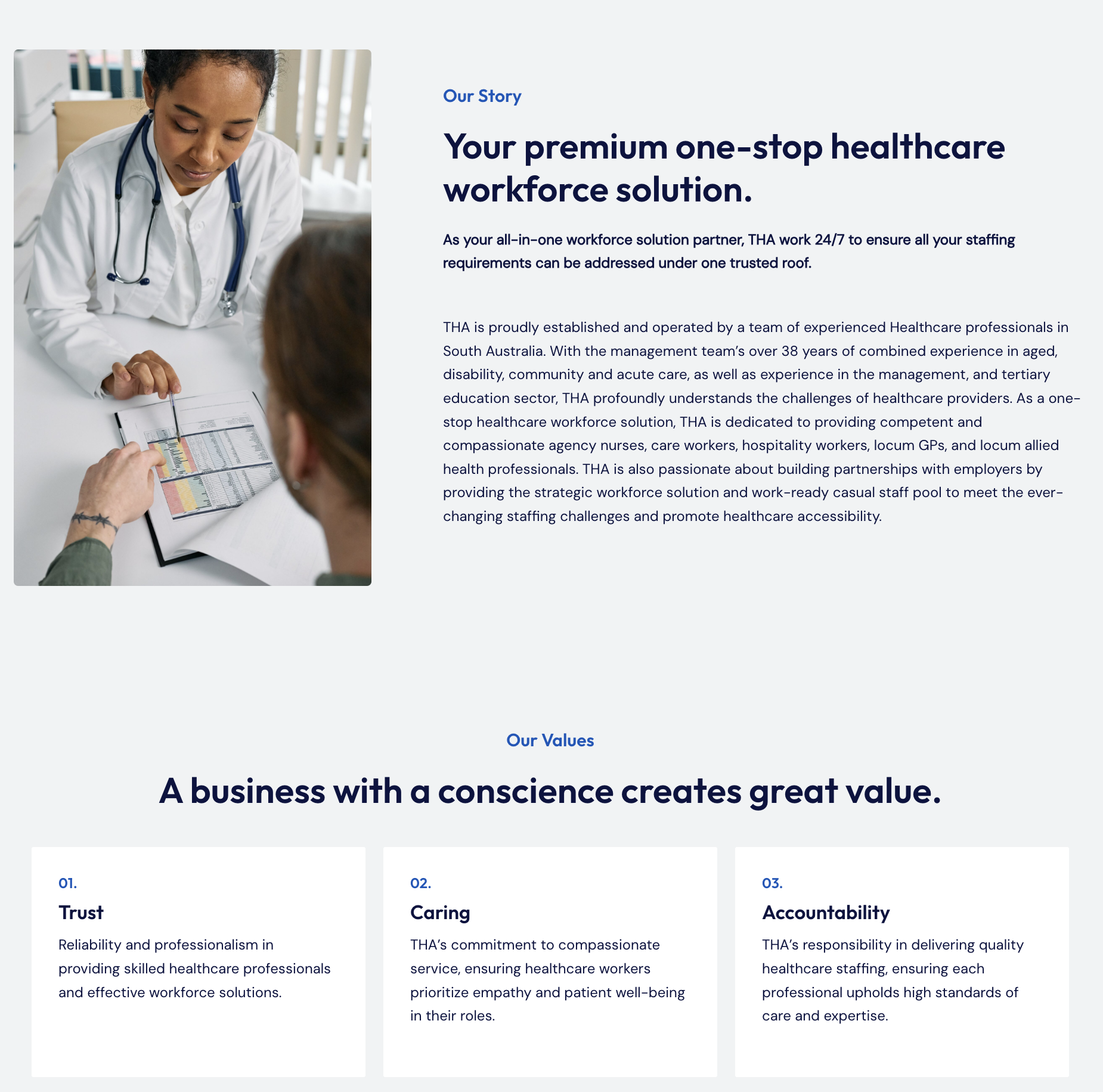 We designed a professional and approachable website that clearly presents each service stream while maintaining consistent branding and accessibility. Key sections include detailed service explanations, pathways for client referrals and staff recruitment, and mobile-optimized navigation. The result is an inclusive, easy-to-navigate platform that reflects THA’s values of care, trust, and responsiveness.