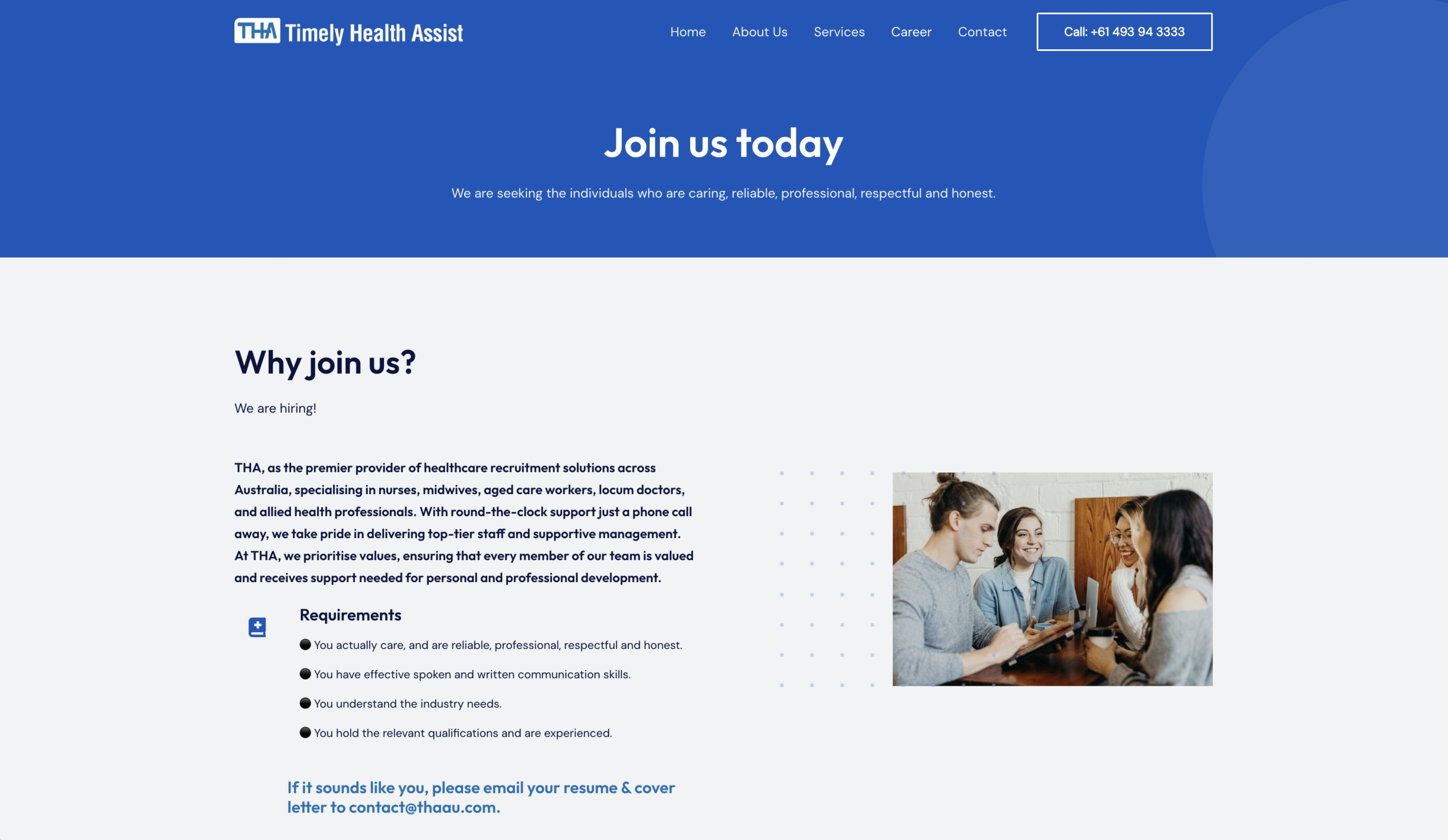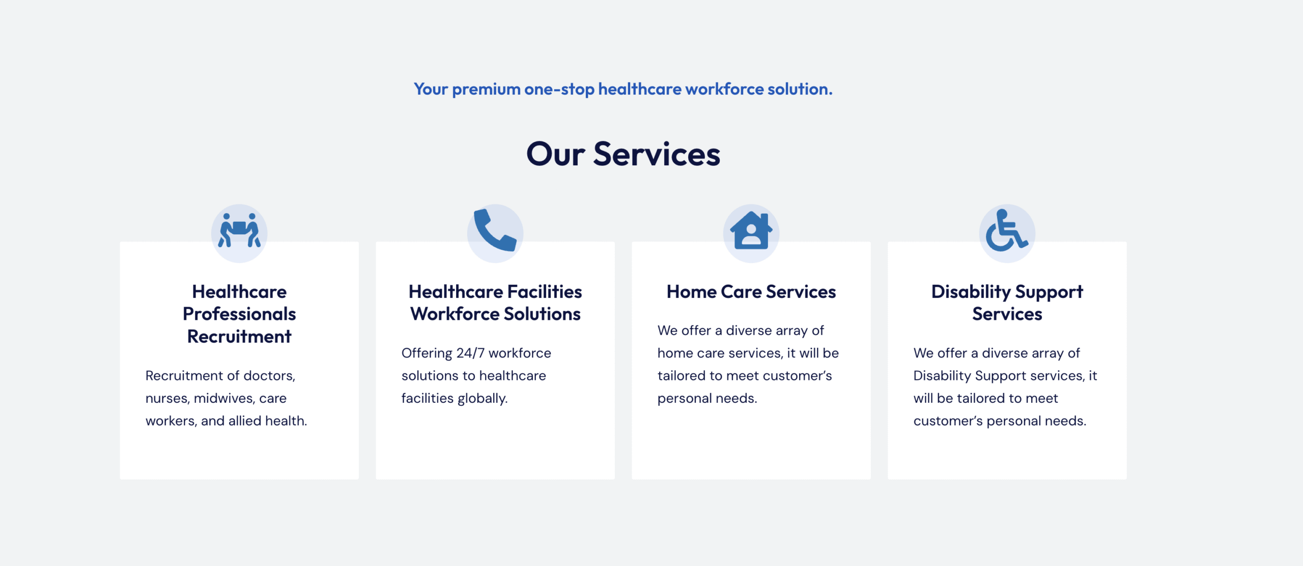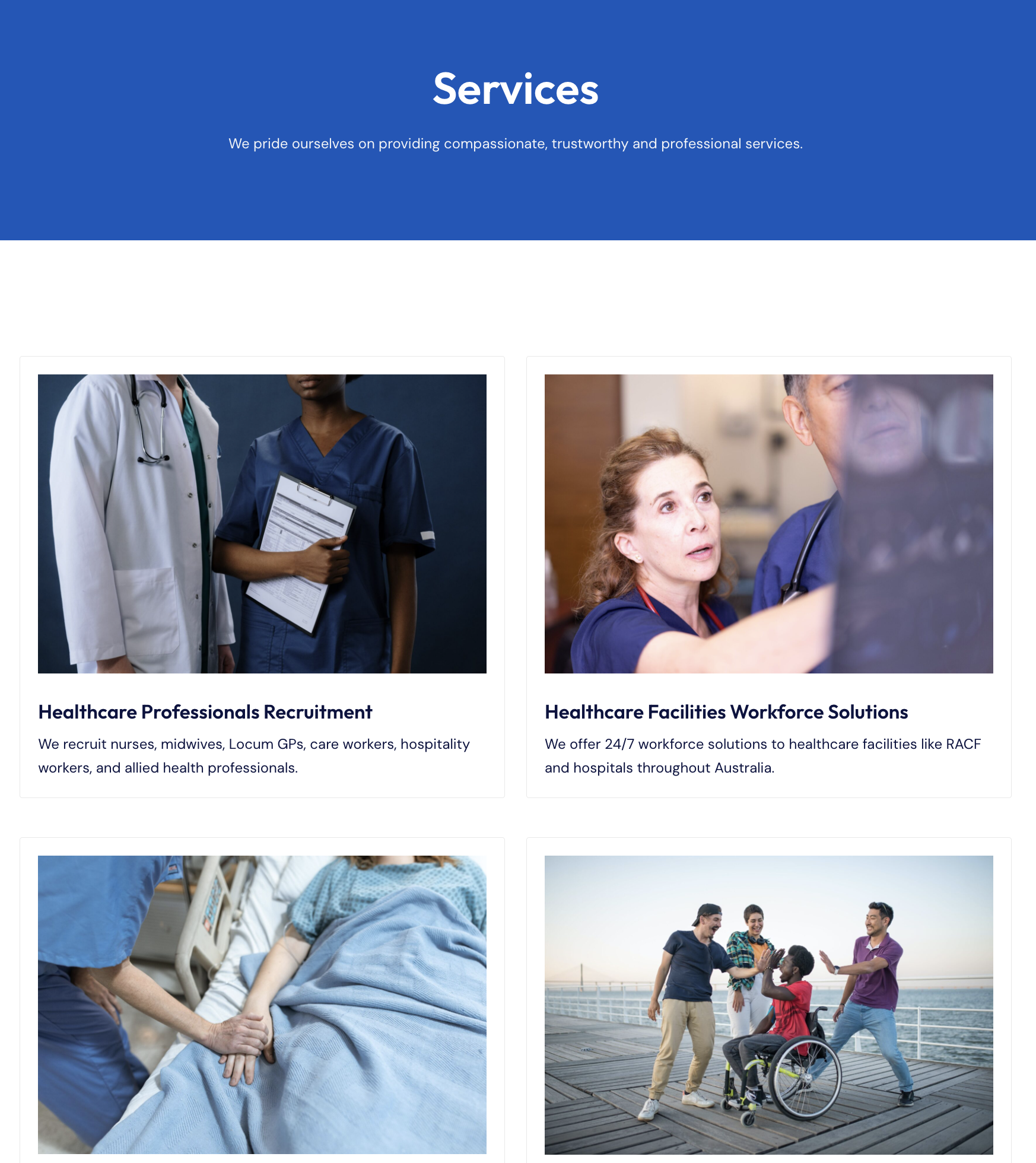 Timely Health Assist is a multifaceted care provider offering NDIS disability support, aged care services, and qualified healthcare staffing under one brand. The client approached us with the goal of creating a clear and trustworthy digital presence that could unify all their service offerings and appeal to a broad range of users—from families seeking care to facilities hiring staff.