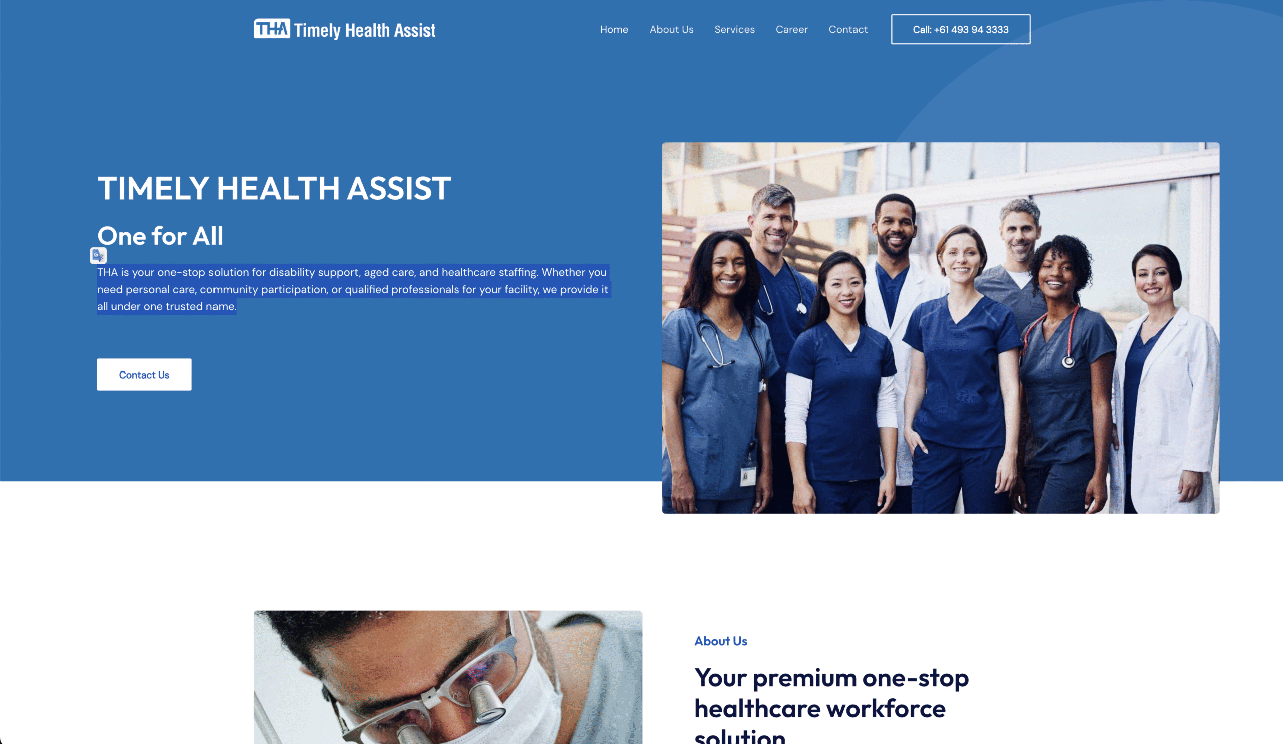 Timely Health Assist is a multifaceted care provider offering NDIS disability support, aged care services, and qualified healthcare staffing under one brand. The client approached us with the goal of creating a clear and trustworthy digital presence that could unify all their service offerings and appeal to a broad range of users—from families seeking care to facilities hiring staff.